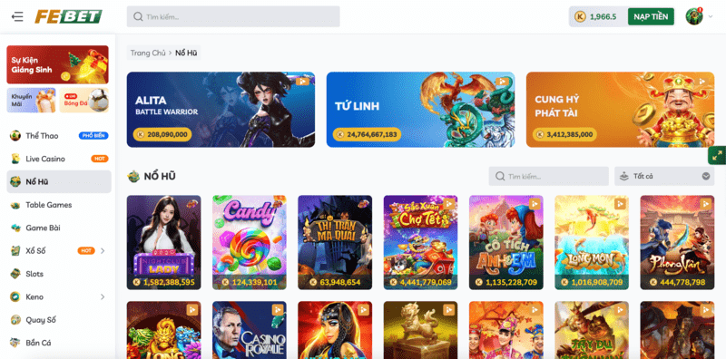 FEBET mang đến các trò chơi nổ hũ đa dạng như Tứ Linh, Cung Hỷ Phát Tài, và Alita Battle Warrior. Hãy chọn trò chơi phù hợp với sở thích của bạn để bắt đầu hành trình săn thưởng.